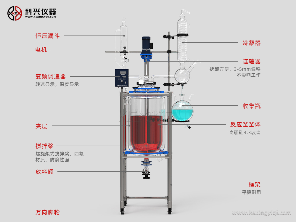 雙層玻璃反應釜為雙層玻璃設計,內層放入反應溶媒可做攪拌反應,夾層可通上不同的冷熱源(冷凍液,熱水或熱油)做高溫反應(配置相應的循環油浴鍋,溫度可以達到300℃)或低溫反應(配置相應的低溫冷凍液循環系統,溫度可以達到-80℃),也可選擇加熱制冷一體循環機;在設定恒溫條件下,在密閉的玻璃反應器內,可根據使用要求在常壓或負壓條件下進行攪拌反應,并能做反應溶液的回流與蒸餾,使用中可以抽成真空,從而做真空反應。是現代精細化工、生物制藥和新材料合成的理想中試、生產設備。它的這種設計使試驗更加的安全,更加的方便。